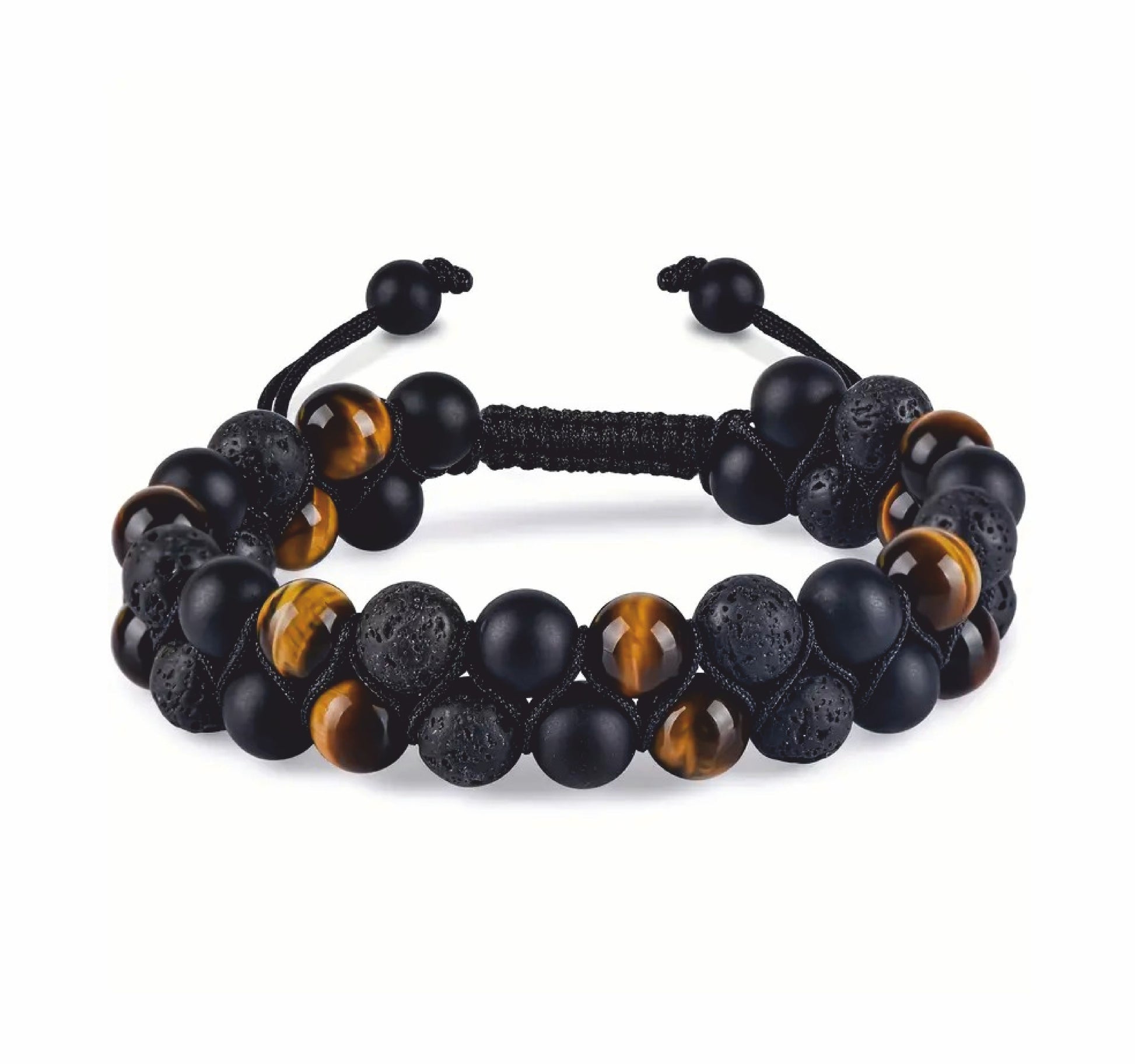 Material: Pedras naturais (pedras ônix, pedra vulcânica, pedra olho de tigre) e cordão.