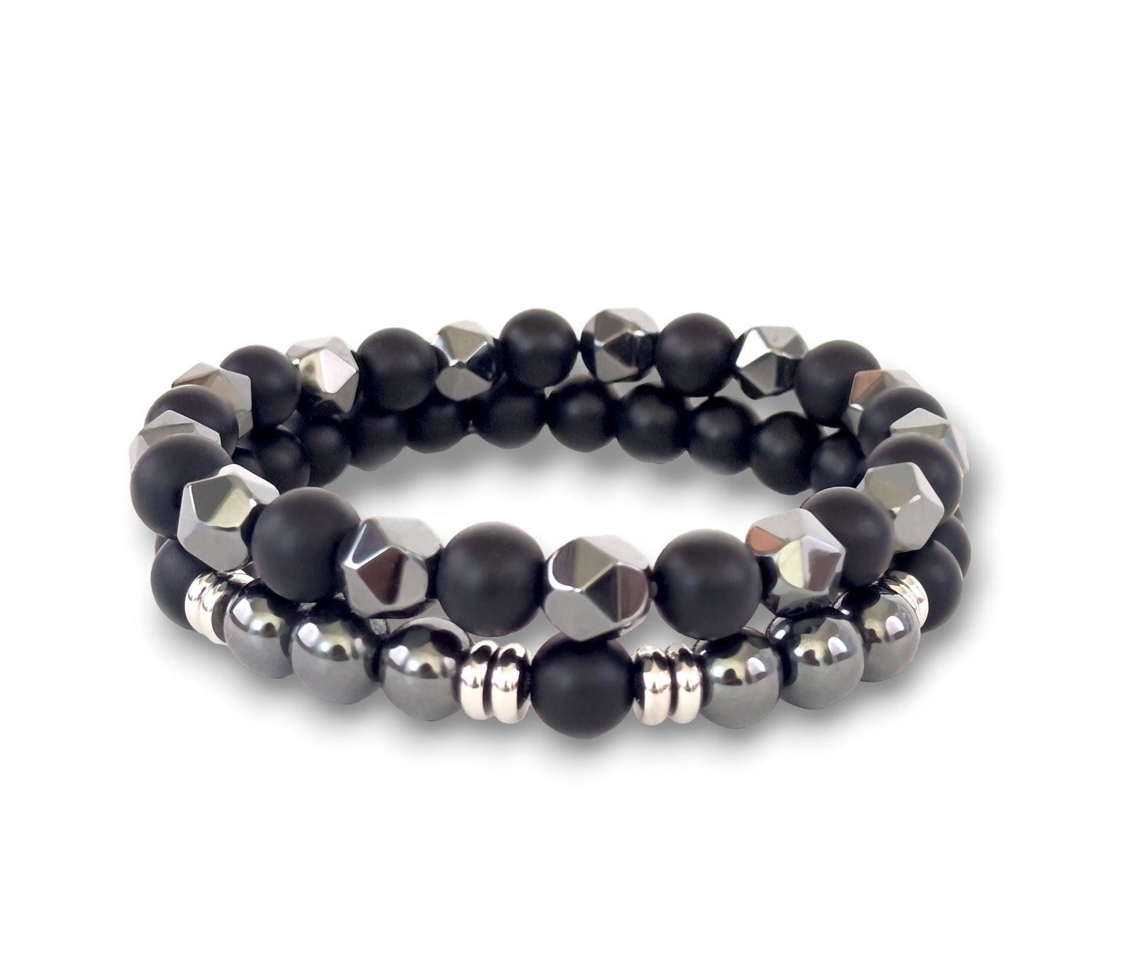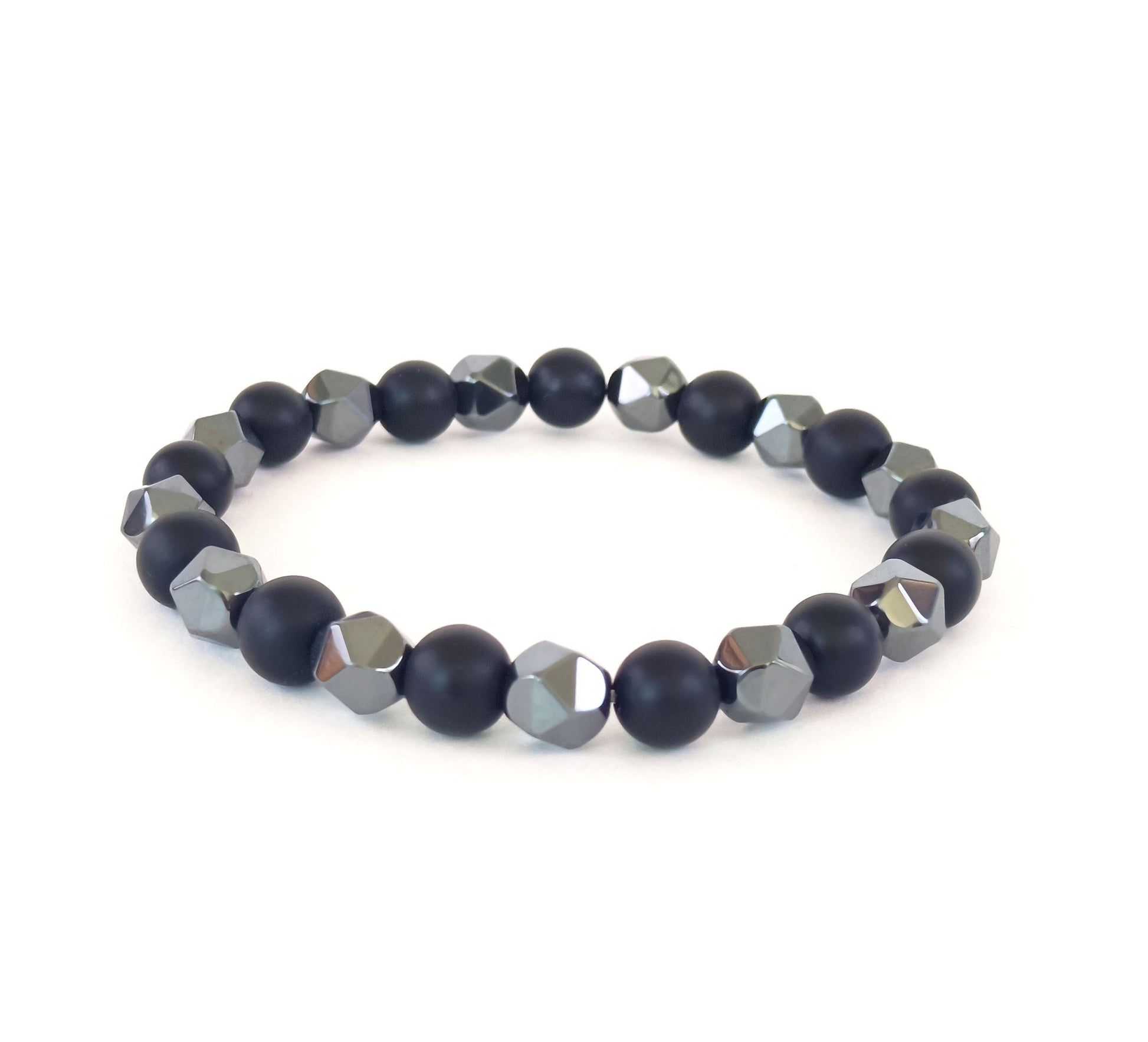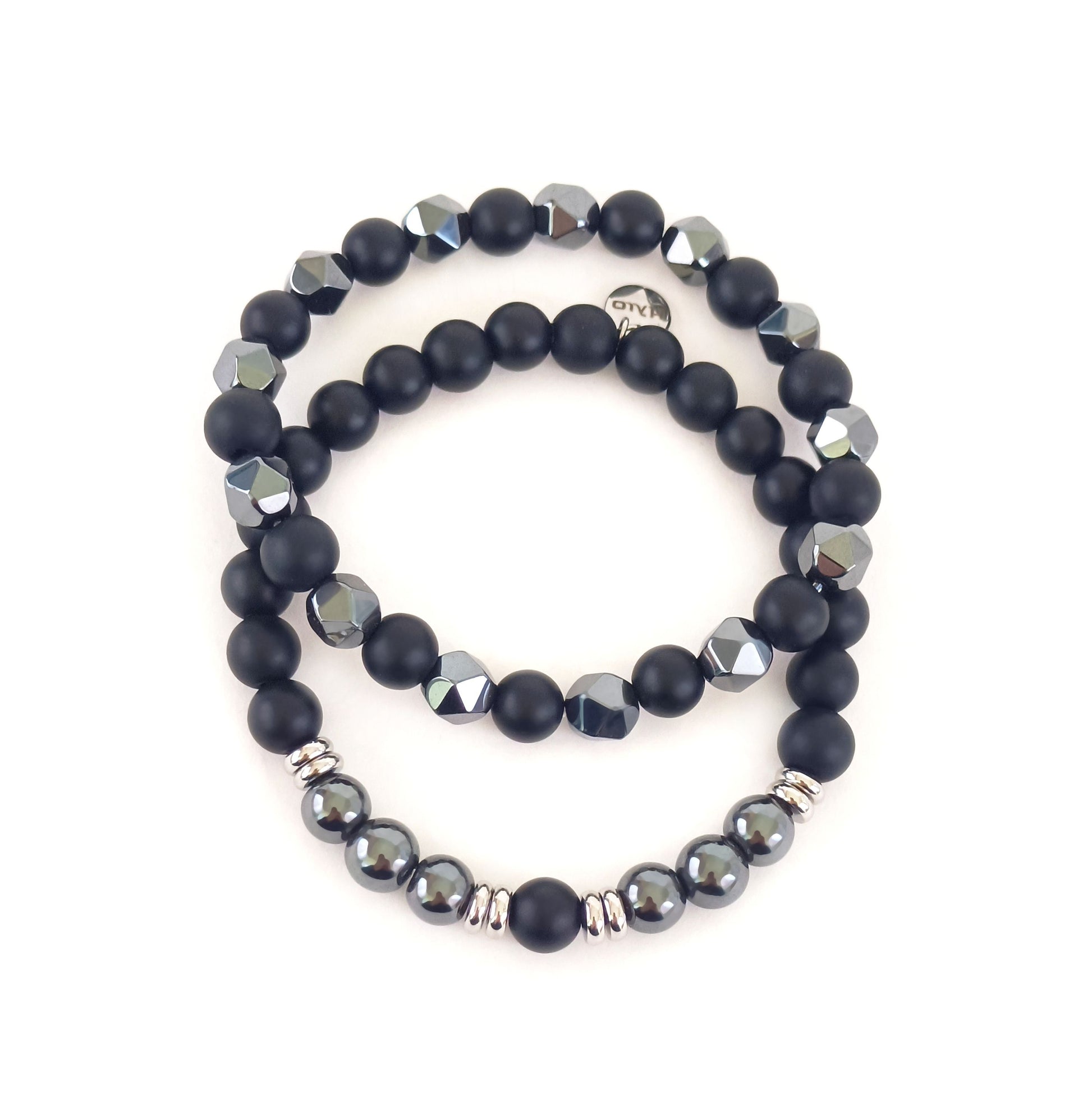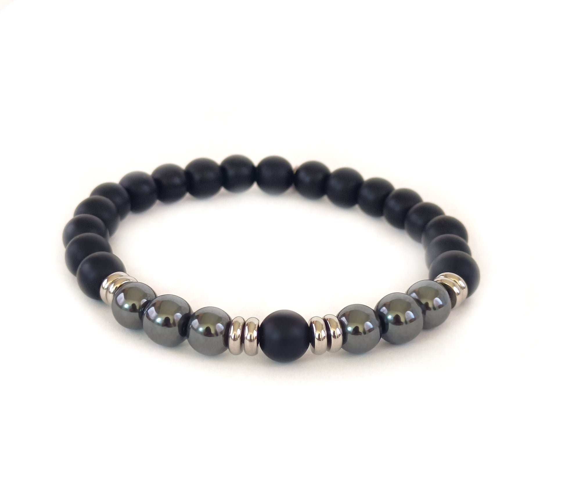 Material: Pedras naturais ( pedras ônix e pedra hematita ), aço inoxidável e silicone elástico.