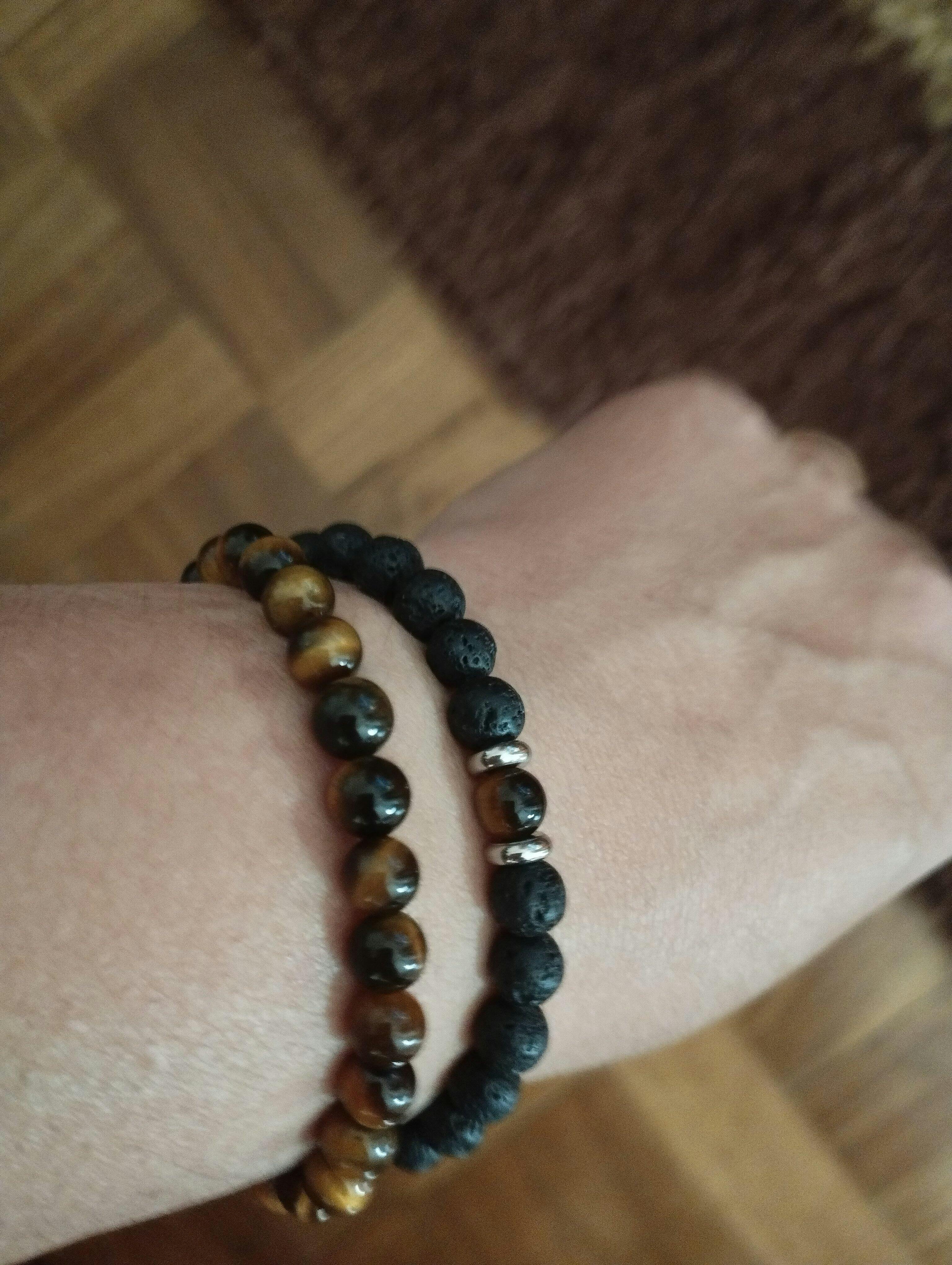 Material: Pedras naturais ( pedra tiger eye e pedra vulcânica ), aço inoxidável e silicone elástico.